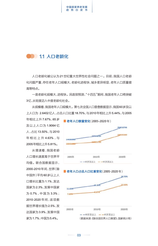 人口老龄化被公认为21世纪重大世界性社会问题之一。目前,我国人口老龄化问题严重,存在老年人口规模大、老龄化进程快、城乡差异明显、老年人口质量提高等特点。据民政部预测,“十四五”期间,我国老年人口将突破3亿,从轻度迈入中度老龄化社会。