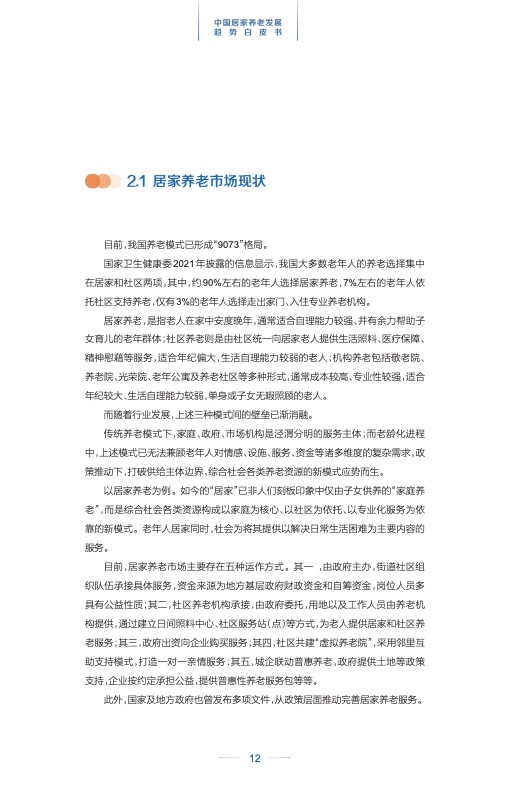 随着老年人口数量不断扩大,我国养老市场的发展受到了更多的关注。目前,我国养老模式已形成“9073”格局,即90%左右的老年人都在居家养老,7%左右的老年人依托社区支持养老,3%的老年人入住机构养老。国家卫生健康委披露的信息显示,我国大多数老年人的养老选择集中在居家和社区两项,其中约90%左右的老年人选择居家养老。