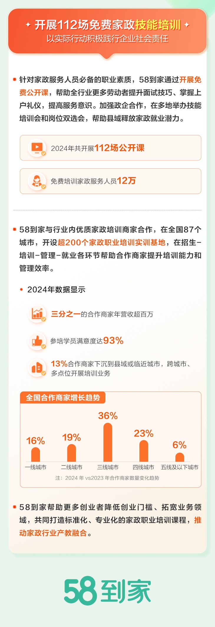 此外,家政培训下沉趋势明显,二线及以下城市参培人数年同比增长229%,58同城高级副总裁李子健透露,目前58到家在全国87个城市开设了超200个家政职业培训实训基地,其中30%的合作商家营收超过百万,参培学员满意度达93%,13%的合作商家已经下沉到县域或临近城市。
