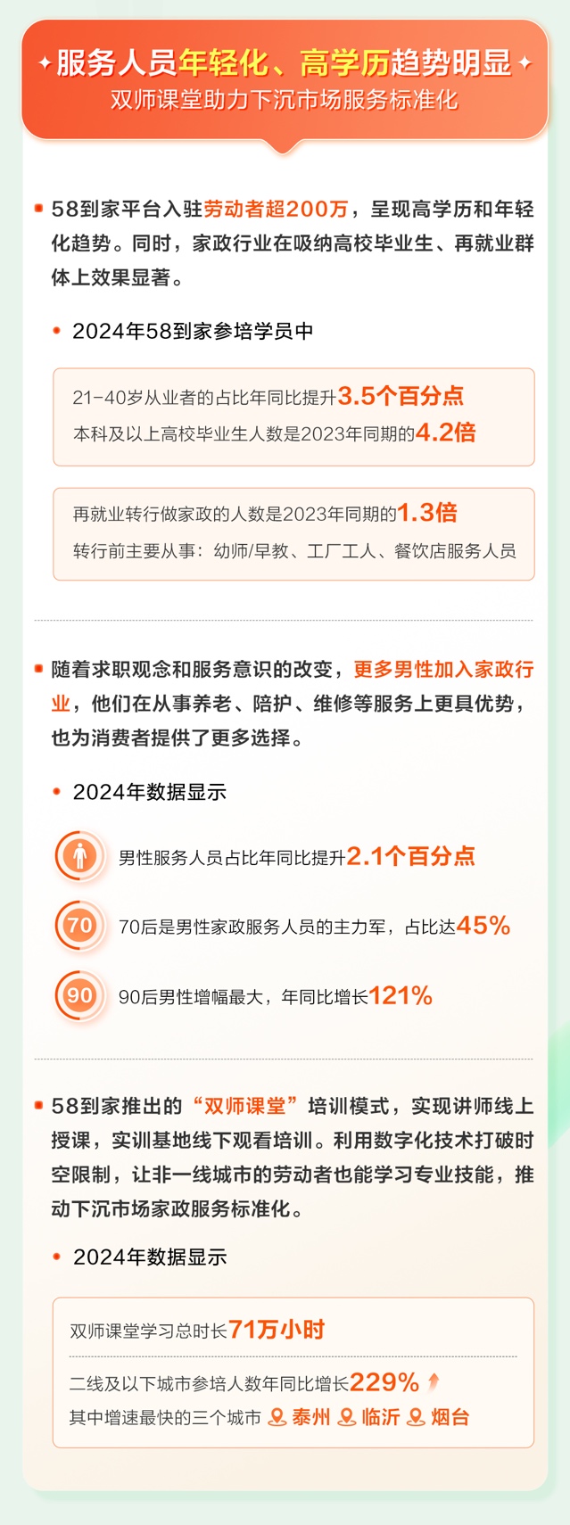 政策与企业创新并驱,人才结构优化升级。2024年,58到家21至40岁从业者占比攀升3.5个百分点,高校毕业生从业人数 4 倍增长,男性家政人员占比提升2.1个百分点,注入发展新动能。同时,58到家积极履行社会责任,开展112 场公开课免费培训12万劳动者,帮助更多的创业者降低创业门槛、拓宽业务领域,共同打造标准化、专业化的家政职业培训课程,推动家政行业产教融合。(中新经纬APP)