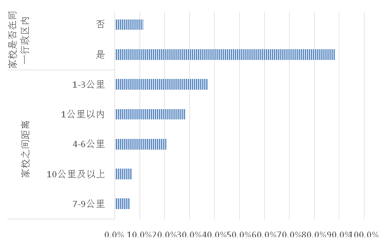 从负责接送孩子人员来看,近六成(58.4%)的受访家庭孩子上下学由父母接送,38.3%的受访家庭由爷爷奶奶或姥姥姥爷接送,还有少量受访家庭(3.3%)由其他亲属、小时工、托管机构接送或孩子自行回家。从通学距离来看,88.5%的受访家庭家校在同一行政区内,超六成(66.1%)受访家庭家校通学距离在3公里内。