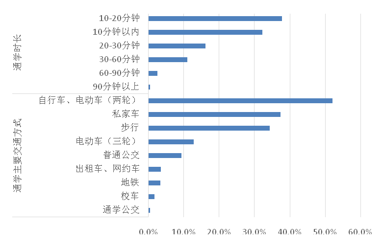 (三)通学时长在20分钟内的占七成,交通方式以自行车、电动车(两轮)为主