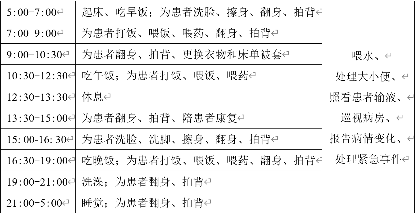 作为专门为住院患者服务的劳动者,护工的日常工作琐碎且忙碌:给患者喂水、喂饭、喂药,照看患者输液;当患者无法自己完成个人清洁时,帮他们洗脸、洗脚、擦身、更衣,协助他们如厕或者使用尿壶、便盆;当患者在病床上无法自己活动时,帮他们翻身、拍背,协助他们上下床、坐轮椅。如果遇到患者大小便失禁,需要为他们换尿布、尿垫,清洗尿壶、便盆;如果遇到患者便秘,还需要使用开塞露并且帮患者用手把排泄物抠出来。这些又脏又累甚至有些家属都会嫌弃的活儿,护工们每天都在以最大的耐心不断地重复着。护工一天的时间安排参见下表。
