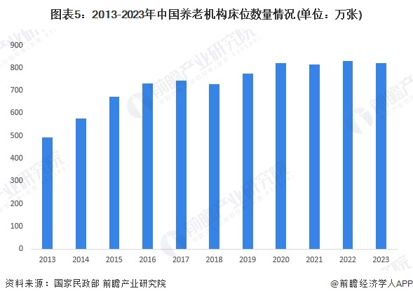 2013-2020年我国及养老机构床位整体呈稳步上升增长趋势。截至2020年底,全国共有养老床位821万张。2020年后,中国养老机构床位呈现波动态势,截至2023年底,中国养老机构床位数量为823万张。