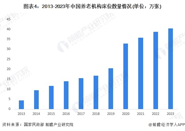 2013-2023年,我国各类养老服务机构和设施数量整体呈增长趋势。根据国家民政部统计的数据,2023年我国各类养老服务机构和设施数量达到40.4万个,比2022年增加1.7万个。