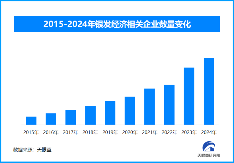 天眼查专业版数据显示,截至目前我国现存在业、存续状态的银发经济相关企业超35.1万家。其中,2024年新增注册相关企业超7.1万余家,从企业注册数量趋势来看,近十年间,银发经济相关企业的注册数量呈现出逐年增长的态势,并在2024年达到顶峰。