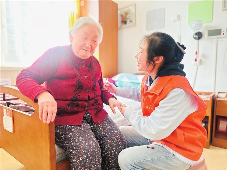 82岁的老人张桂娥是该养老服务中心的全托常住老人,已经入住中心有一年时间了。一年前,老人因腰部不慎摔伤,行动不能自理,为了不让工作繁忙的儿女操心,老人和家人商量后,决定在离家不远的广武门街道综合养老服务中心,进行全托照护和康复疗养。在护理员寇晓平和同事们的精心照顾下,张桂娥老人已经能够借助助行器或轮椅慢慢行走。