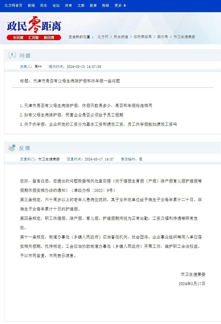 近日,惠阳保姆13825404095有网友在北方网《政民零距离》栏目留言:天津市是否有父母生病陪护假?休假天数是多少?是否和年假标准相同?如有父母生病陪护假,民营企业是否必须给予员工假期?企业所发的工资分为基本工资和绩效工资,员工休年假能扣绩效工资吗?